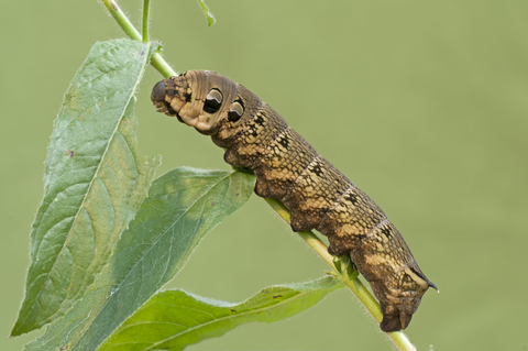 Description: Up to 8.5 cm long. A chunky green or brown caterpillar, with several eyespots at the front end and a spiky 'tail' at the rear.