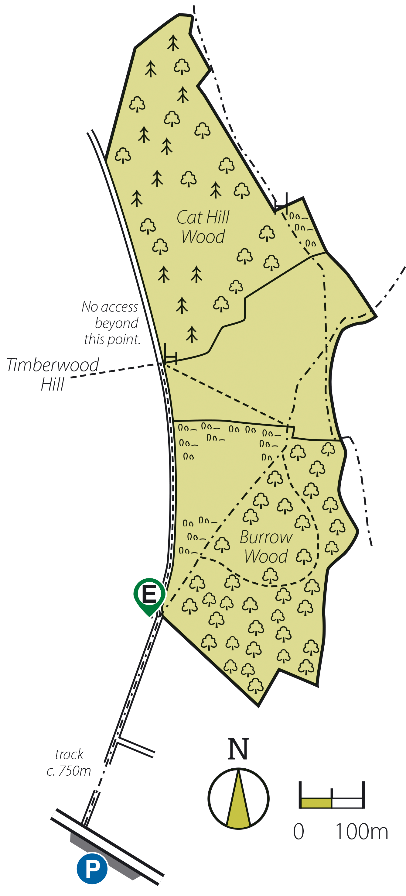 Burrow Wood is an ancient woodland dating from the mid-1500s. It is dominated by pedunculate oak, with occasional ash and sycamore. The entrance to the wood, which is now very open, once contained mature elms, but only a few scattered elm suckers remain. The understorey is predominately rowan and holly, some of which rival the oaks in height and girth!