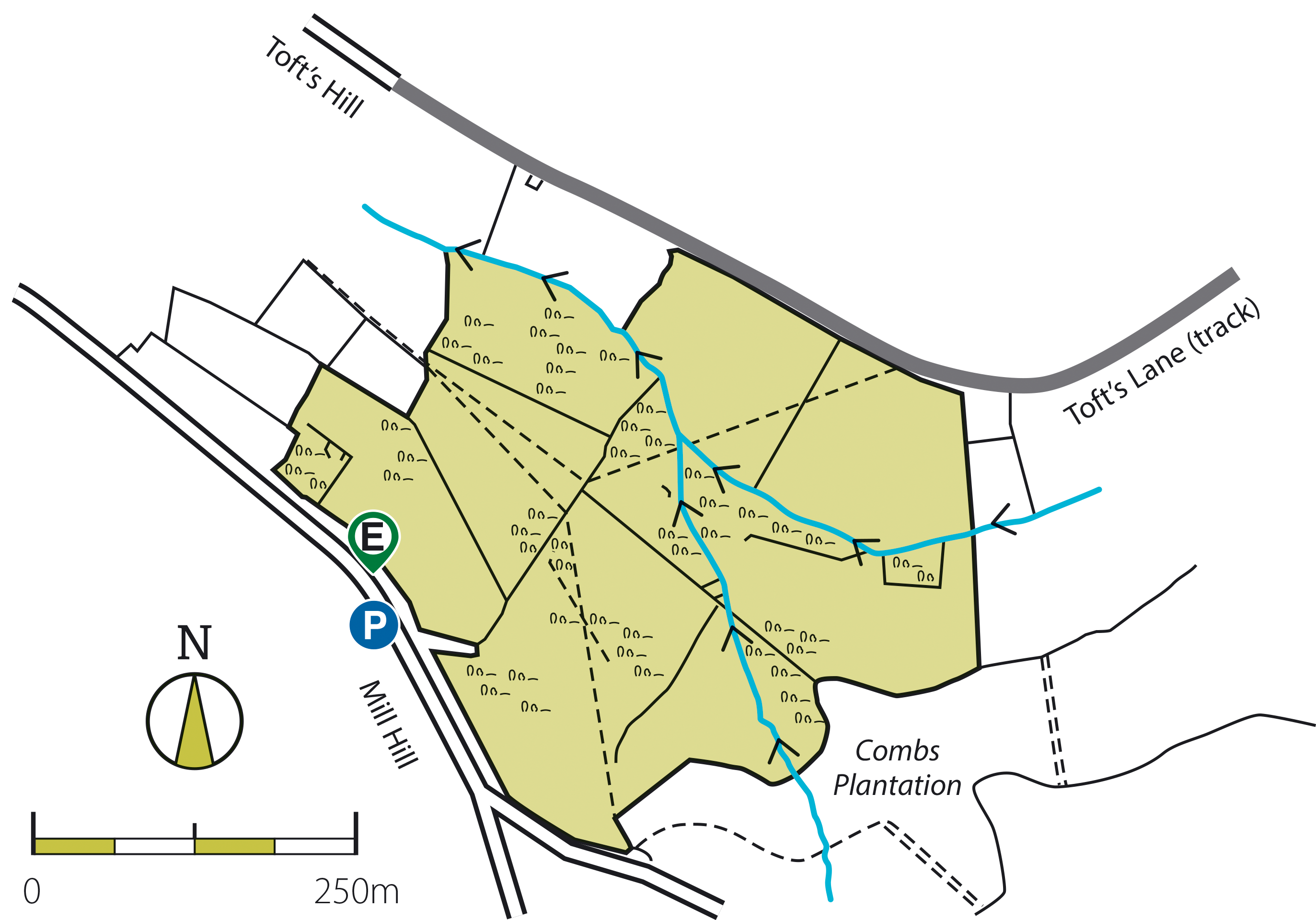 A patch of gorse, with bright yellow flowers, gives the best display is the spring. Listen carefully: on hot sunny days, the seed pods can be heard cracking as they split open to scatter their seeds. Just before the far hedgerow there is a small enclosure on your left planted with alder trees. You can see the upright jointed stems of water horsetail, a primitive plant related to ferns, now relatively uncommon in Leicestershire. There are one or two adder’s-tongue ferns. These are difficult to find, but hopefully will spread across the reserve. From Toft's Lane, you can appreciate the mosaic of small fields, hedgerows and scattered scrub which make up this piece of old countryside, now a haven for birds, bats and invertebrates.